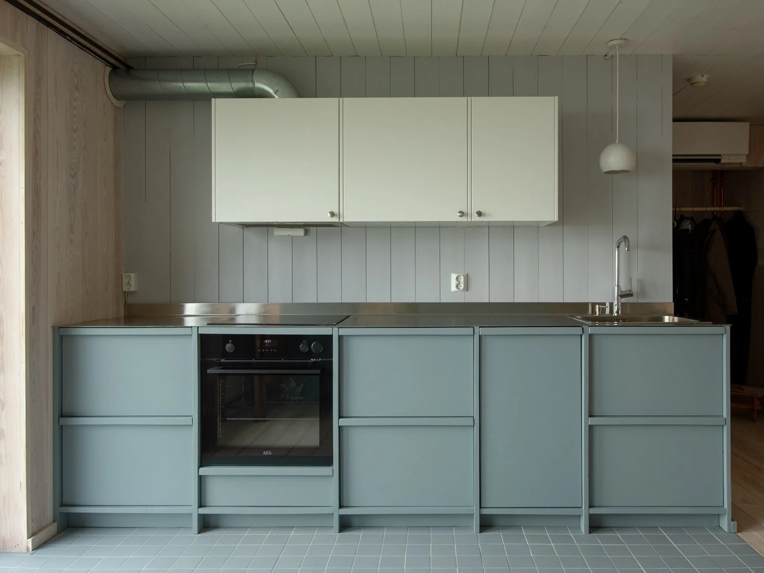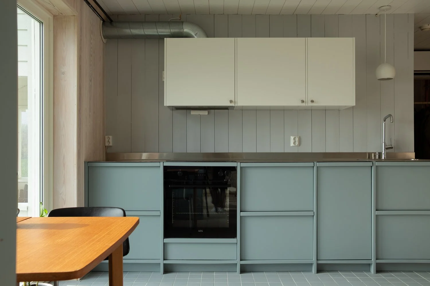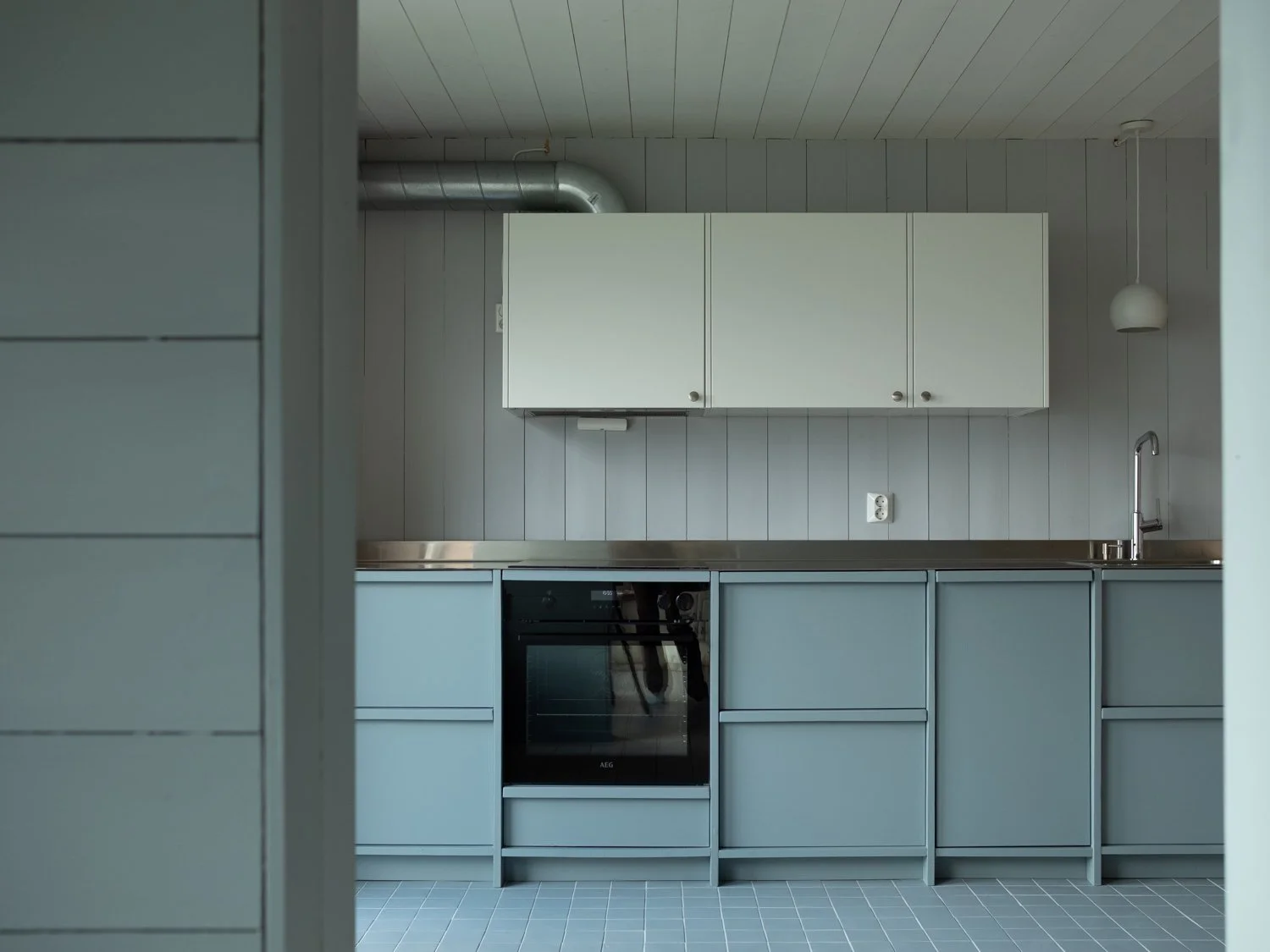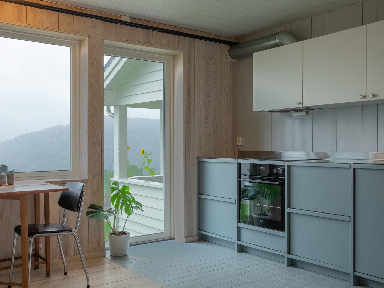 RENOVERING LEILEGHEITSamtlege nye overflater i måla og umåla furu, fliser i gang og kjøkensone. Nytt kjøken med altandør som gjev tilkomst til hage. Fliser: Winckelmans pale blue frå Modena.