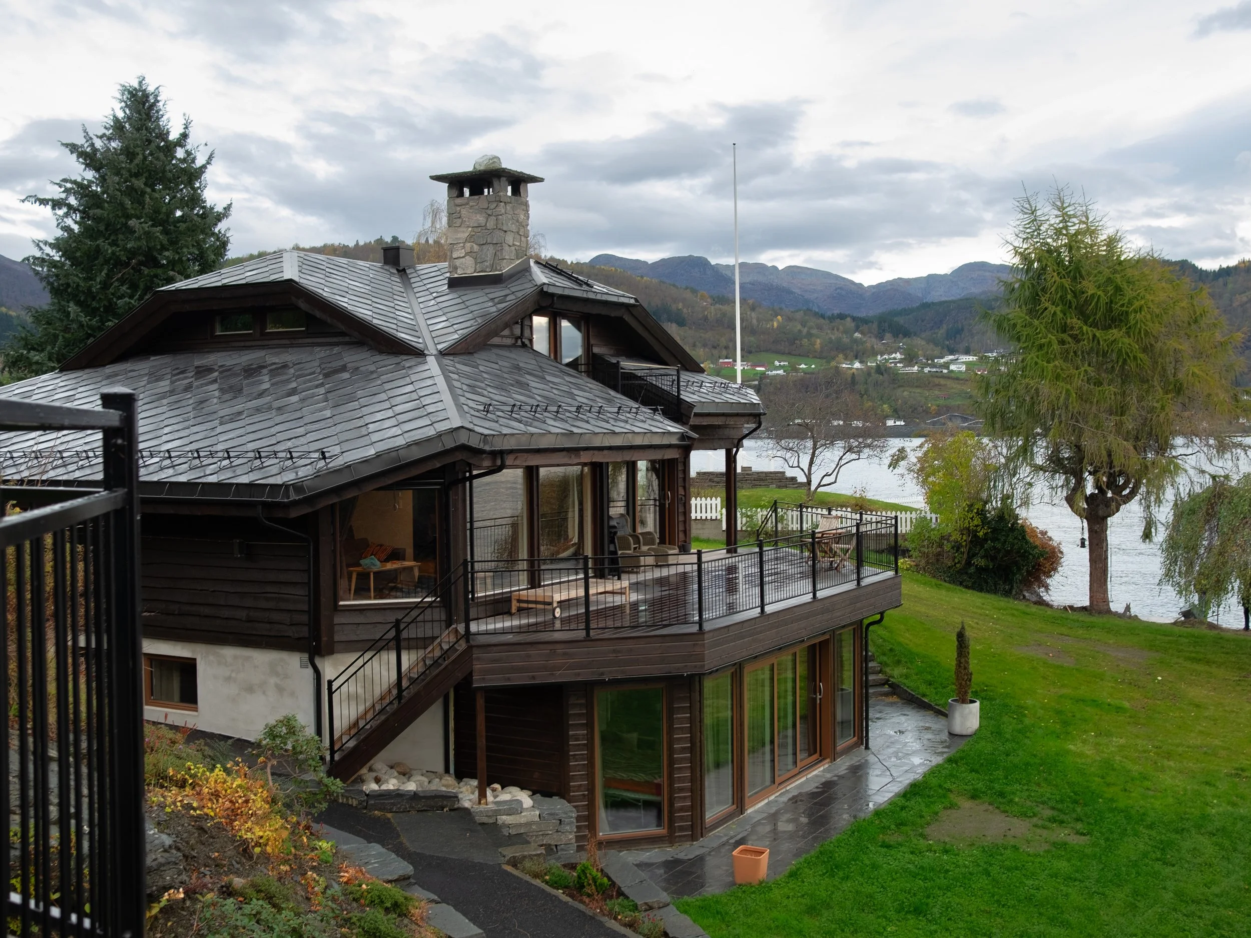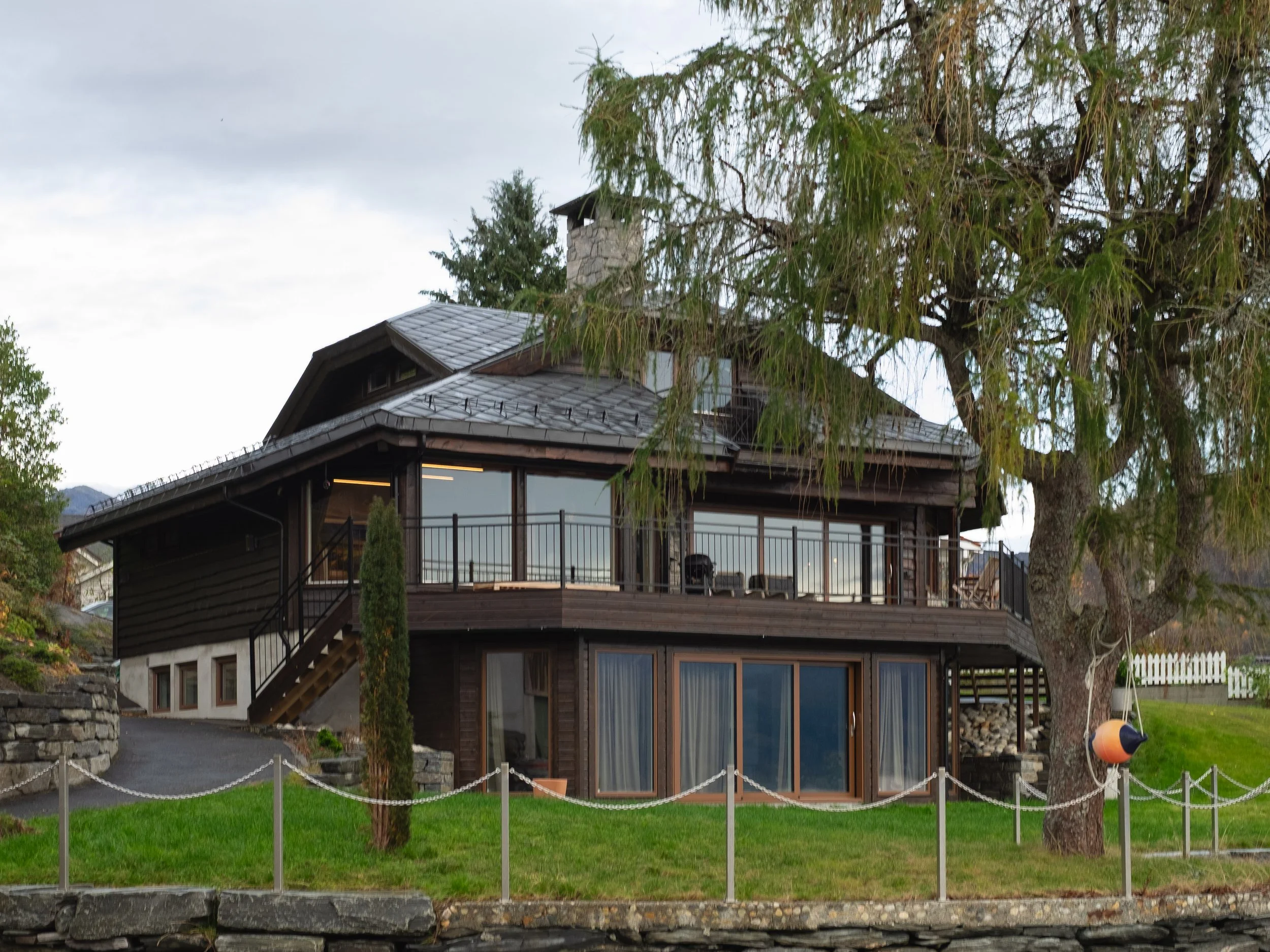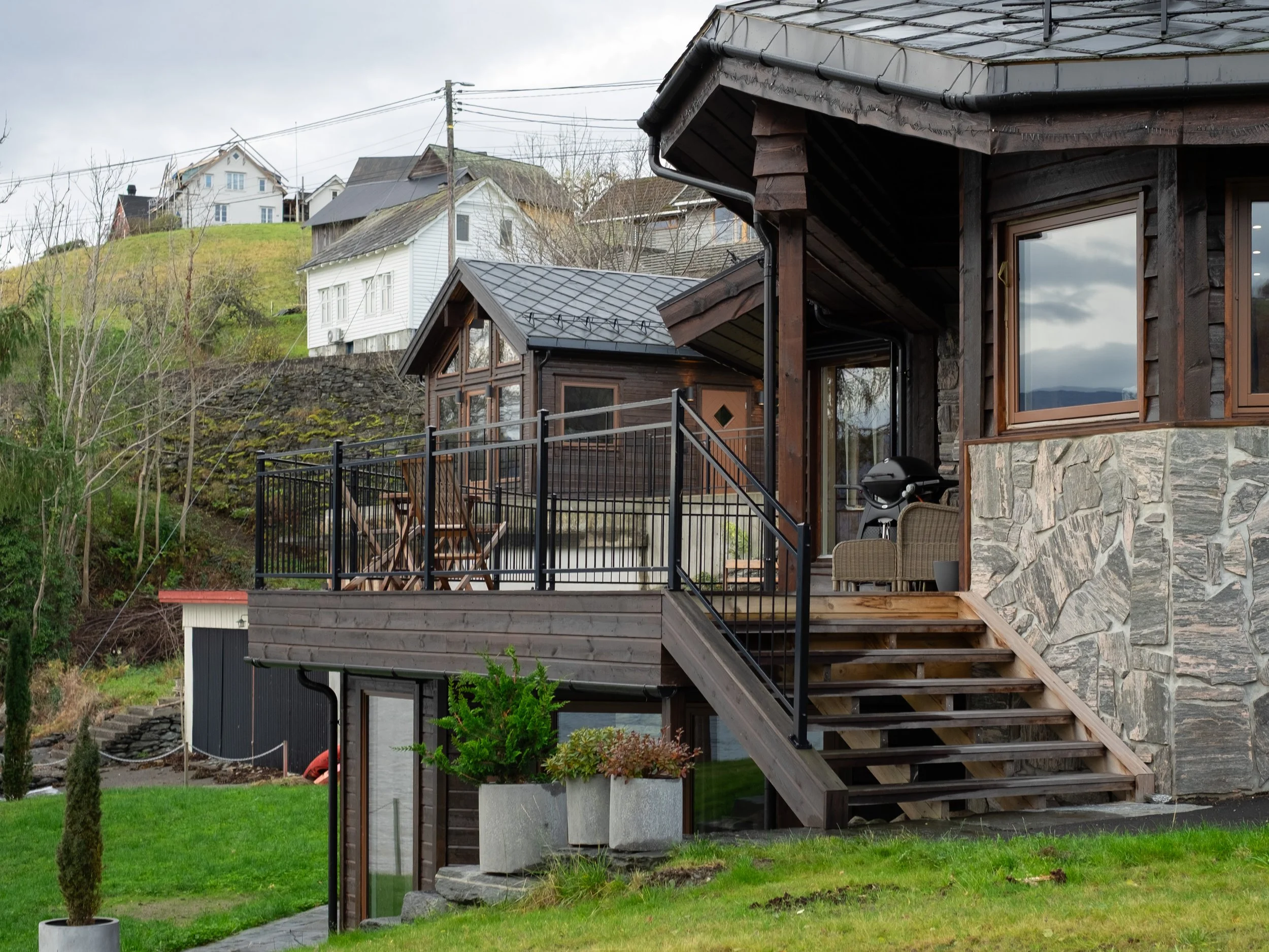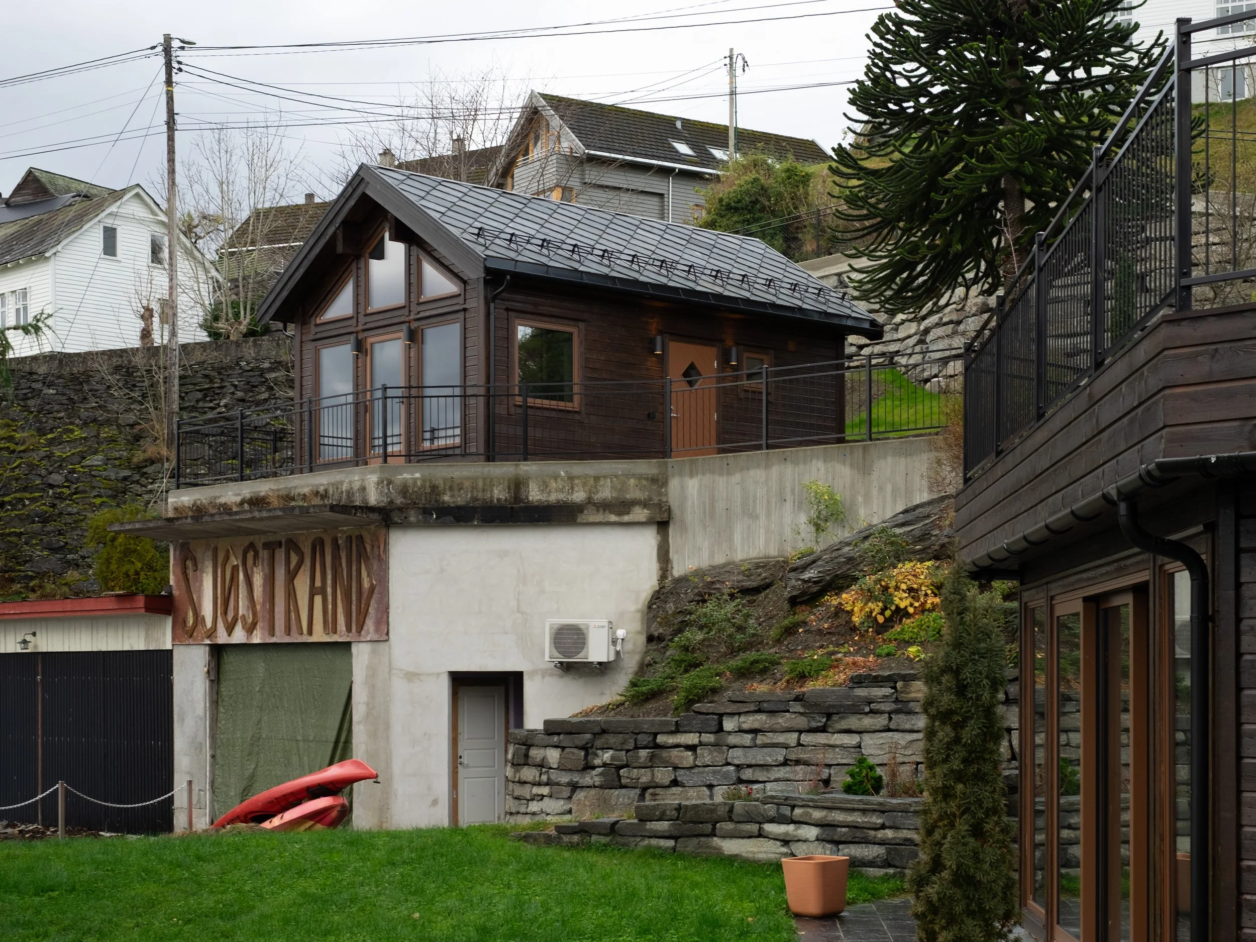 Renovering av bustad innvendig og utvendig. Utvida terrasse med nye trapper til hage, og ny vinterhage under terrasse. Nytt anneks over naust.